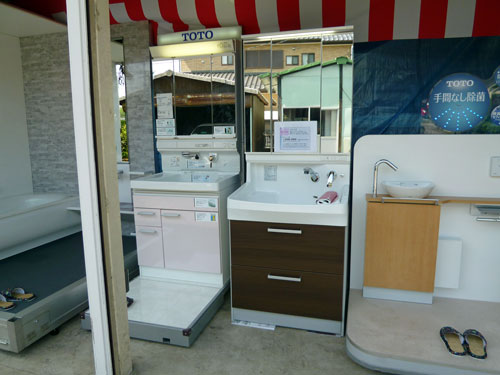 今回はご覧のように水廻り設備実物をたくさん展示、最新の機能を体感して頂きました。